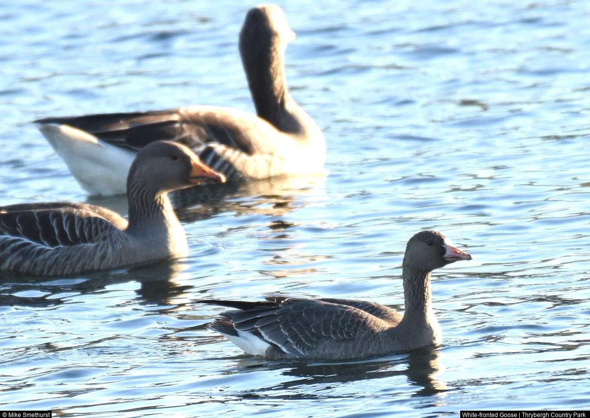 • Thrybergh CP: White-fronted Goose - 1 - Arrived with Greylags at 10:50. Possibly different bird to yesterday as beak pattern and extent of white front show slight differences. ; Kingfisher - 1